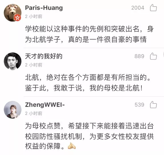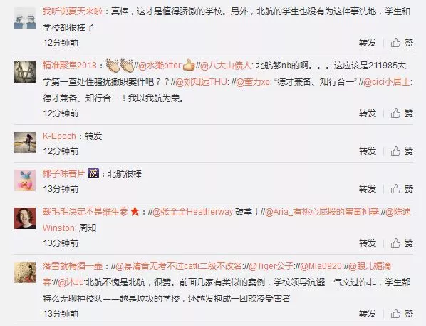 北航纪委很快答复了邮件。指出知乎删帖系陈小武小我行为,取学校无关。别的否定了陈小武是副校长候选人一事,指出学校目前的校带领职务无空白。而且了举报人的小我现私消息不会被泄露,了举报人、证人未来需要学校供给学历学位证明的时候没有阻力。获得校方,罗茜茜等人供给了部门录音。1月11日晚,北航微博发布布告,决定撤销陈小武研究生院常务副院长职务,打消其研究生导师资历,撤销其教师职务,打消其教师资历。取之前良多出性侵丑闻的学校比起来,北航处置此事务的速度和立场遭到了大师的褒。仅仅十天的时间,北航就把工作处置得点水不漏,就连当事人罗茜茜也正在第一时间给母校点赞。